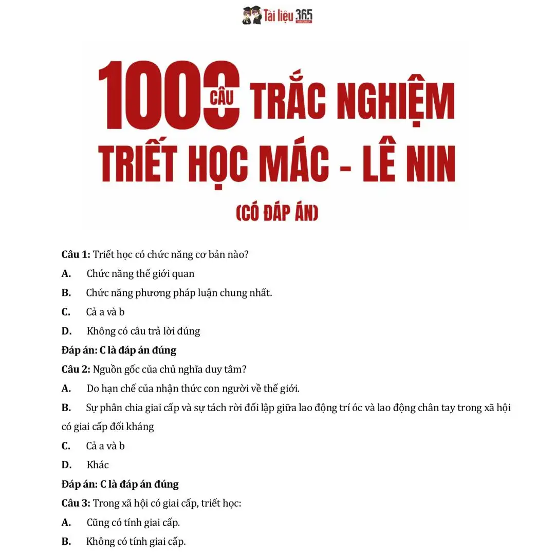 Triết họcPDF – 1000 Câu trắc nghiệm Triết học Mác – LêninĐăng vào 04/10/202506/11/2025 bởi Admin Tailieu365.vn giới thiệu đến quý thầy, cô giáo và các em sinh viên tài liệu 1000 Câu trắc nghiệm Triết học Mác Lênin được biên soạn dựa trên giáo án chuẩn, kèm đáp án, …